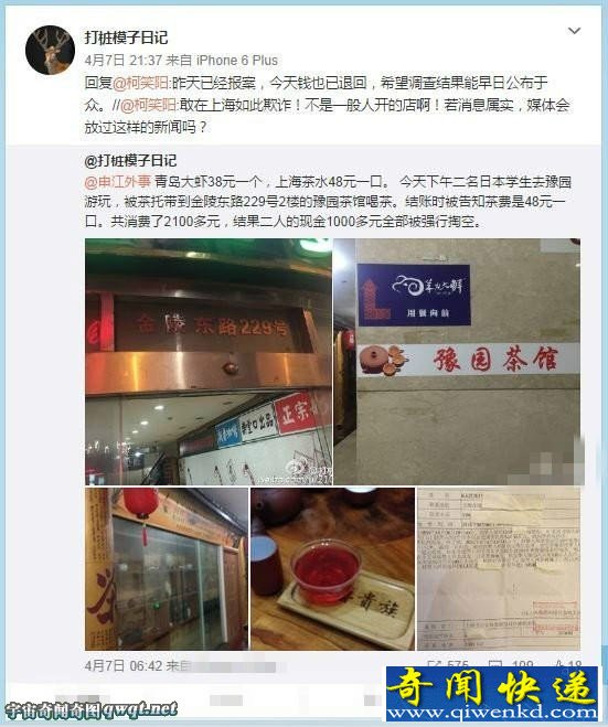 有网友发布微博称,4月6日下午,有2名日本学生前往上海豫园景区游玩,被茶托带到金陵东路229号2楼的豫园茶馆喝茶。“结账时被告知茶费是48元一口。共消费了2100多元,结果二人的现金1000多元全部被强行掏空。”