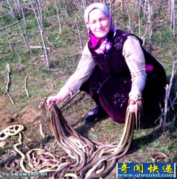 据俄罗斯连塔网4月6日报道,日前,俄罗斯达吉斯坦农妇萨吉巴特·伊斯兰玛戈梅多娃在自家园子里种土豆时,无意间发现一个蛇窝,她用手中的铁铲铲死了约80条蛇,还有一些蛇“侥幸逃脱”。她双手拿蛇的照片被儿子发到网上后,引起俄罗斯媒体和网友的广泛关注。