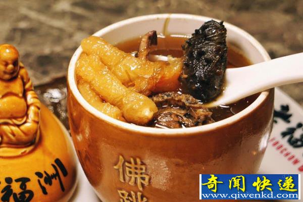 这才看到本来是托钵人的瓦罐中传来的香气,据说这个乞丐每天都会将自己讨来的山珍海味”和自己的剩酒倒在一起烹煮,最终才能得到这样一锅美味的菜肴,而饭铺的老板也因此受到开导,开端将其改造成了古代的佛跳墙,而佛跳墙这个名字则是因为有文人描绘这道菜的香味“佛闻弃禅跳墙来”也就是说香的佛都跳墙出来想要吃。