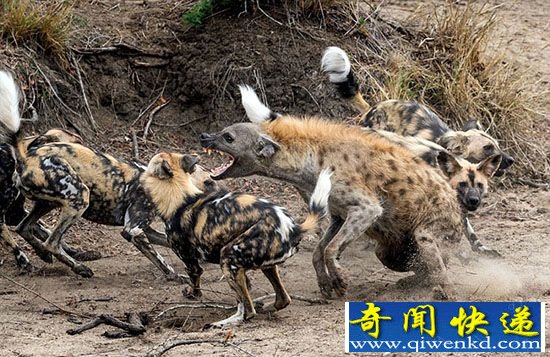 【奇闻快递】12月8日消息,南非一只落单鬣狗被八只咆哮的野狗围住,见状发动反击,迅速冲向附近的河中。这些野狗由于怕水最终放弃了追逐,偷偷溜走去他处觅食了。