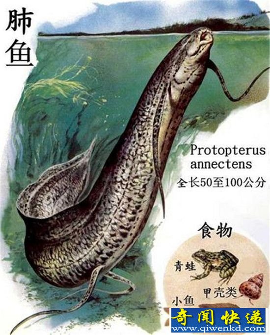 肺鱼(lungfish)是一种非常特殊的物种,平时用鳃呼吸,在干涸时可以用鳔当作肺呼吸,它是生物进化史遗留下来的重要遗产。它们有着鳗鱼一样的身体,“四肢”骨瘦如柴,正是这种特殊的动物有可能是动物行走行为最早的革命前锋,是从水进入陆地的“活化石”,据此科学家需重新绘制生物从水生到陆生的进化历史过程。