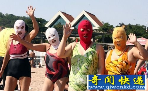 青岛第一海水浴场沙滩上,几名女士防晒出了高招,每个人脸上帶着蝙蝠侠一样的面具以此防止太阳暴晒自己的皮肤。