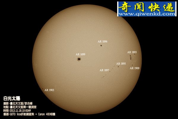 天文馆表示,编号AR 1899的黑子约相当于12~13倍地球总表面积,看起来就像太阳表面多了个黑洞一般。另一群AR 1897黑子宽度更达约35万公里,相当于54~55倍地球直径之多,相当于太阳直径的四分之一,相当惊人!这么多的大型黑子,相当符合科学家提出太阳活动将在2013年底进入极大期的预测。